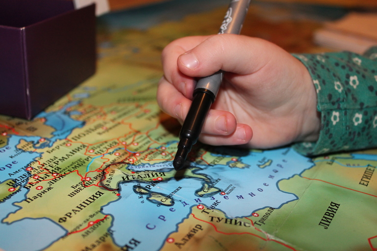 1. По традиции мы начали искать страну. Это не просто задание, это способность ориентироваться и развитие мышления :" Италия находится на материке Евразия в восточной его части". Дочка уже очень быстро справляется с такого рода заданиями, брат очень часто помогает, он может усесться как раз на ту страну, которую мы ищем, тем самым увеселяя наше приключение)))