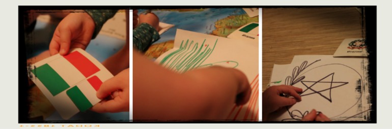 Пытаемся схематически изобразить эмблему страны, весь творческий опыт намного лучше запоминается детям, чем просто просмотры. Тут как раз пригодились осенние листочки, на эмблеме Италии изображены оливковые и дубовые листья.