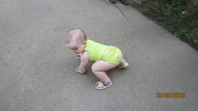 а вот так на асфальте. коленки все были сбиты в синяках, но ходит не хотел пока не стал уверен. зато без шишек))))