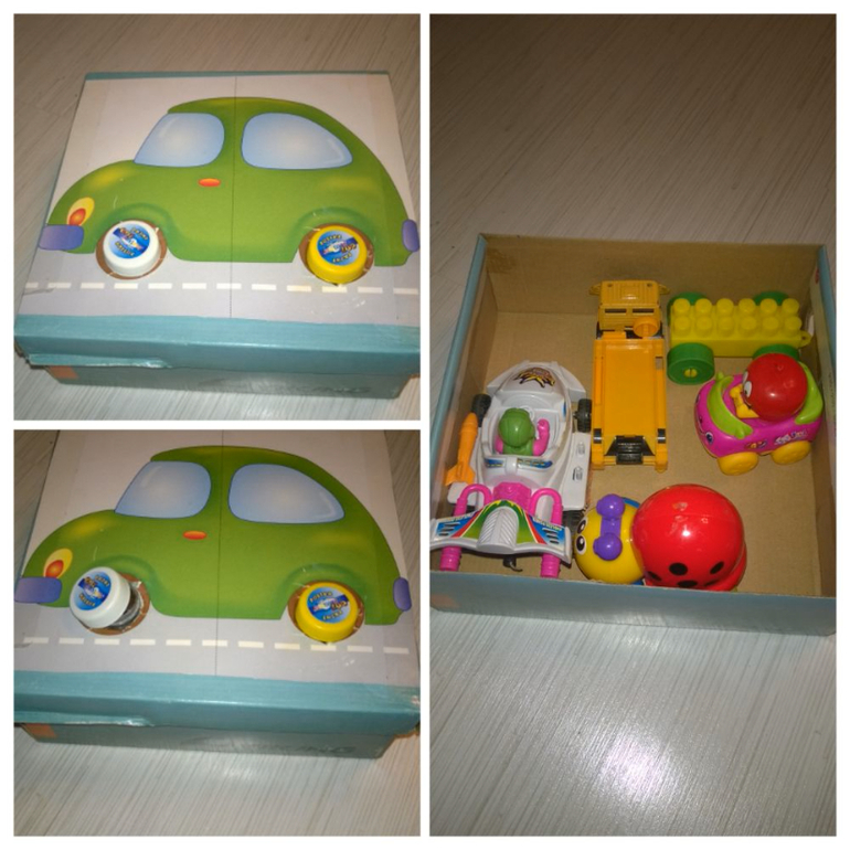 Коробочка с машинкой, вместо колес -крышечки, учимся откручивать. В коробке у нас теперь мини гараж, сложили все свое четырехколесное имущество.