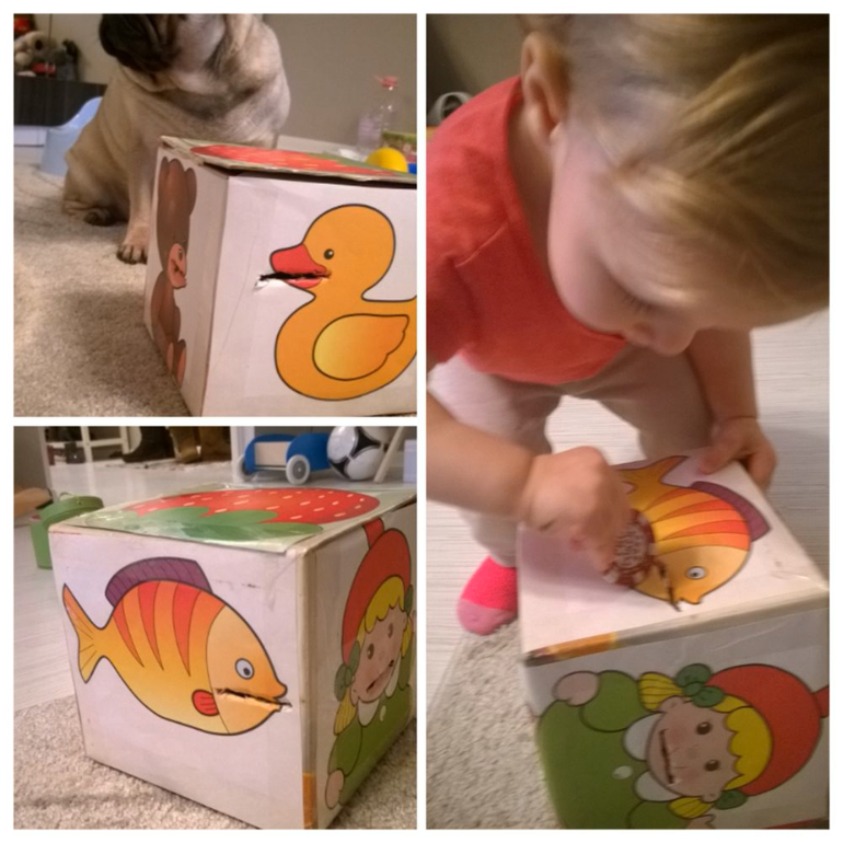 Даже не знаю как это назвать, в общем на коробочку наклеили картинки, сделали прорези, так мы кормим зверюшек и куклу. Над куклой с прорезью не ржем)))) на нас папа и так уже косо смотрит)) В качестве корма у нас папины фишки от покера. Доча оценила) картинки взяла из школы 7 гномов.