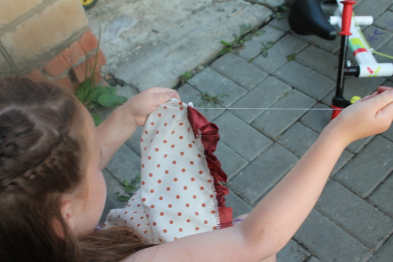 А Василиса такая заявляет: "а что у нас гардин не будет?????" Пришлось папе из шнура старого сделать гардину.А вот шитьем шторок Василиса занялась сама) с моей помощью!