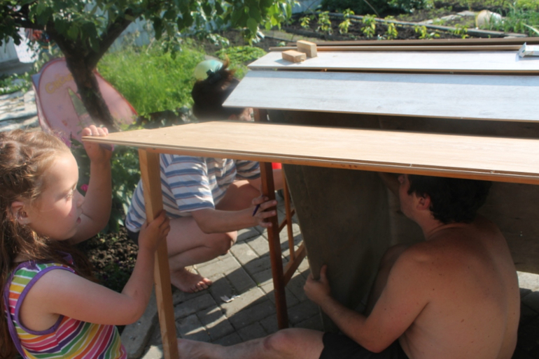фанеру,доски,..в общем,всё, что могло помочь нам в строительстве и