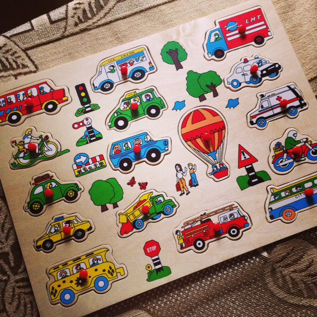 Купила на ескай сразу большой, потому что пазлы из трех-пяти деталей думаю ему быстро наскучат. Если покупать, то сразу несколько. А в нашем сразу куча деталей, и это машинки! Думала, будет сложно ему, но нет, отлично пошел. Можно придумать разные игры и позже как подрастет, усложнить и разнообразить задачки.