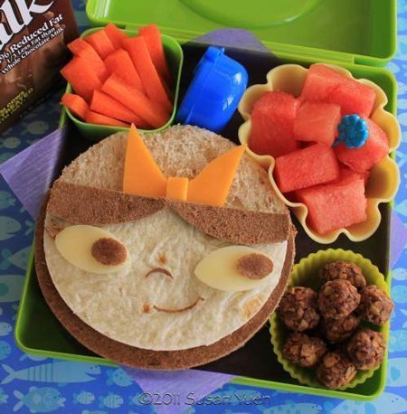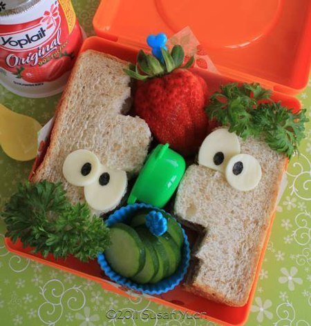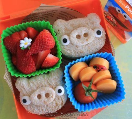 А мне как-то печально.Там где свинки из ангри бердс, это что два куска хлеба, 5 ломтиков морковки и несколько клубничек, и это обед?!Может это и забавно, но как-то скудно всё. Два огромных куска хлеба, крошечные кружки сыра и одна клубничка. И, вообще, я привыкла на обед кормить ребенка супом. Он не милый, не красивый, но полезный и питательный. Так что мне не понять этих картинок.