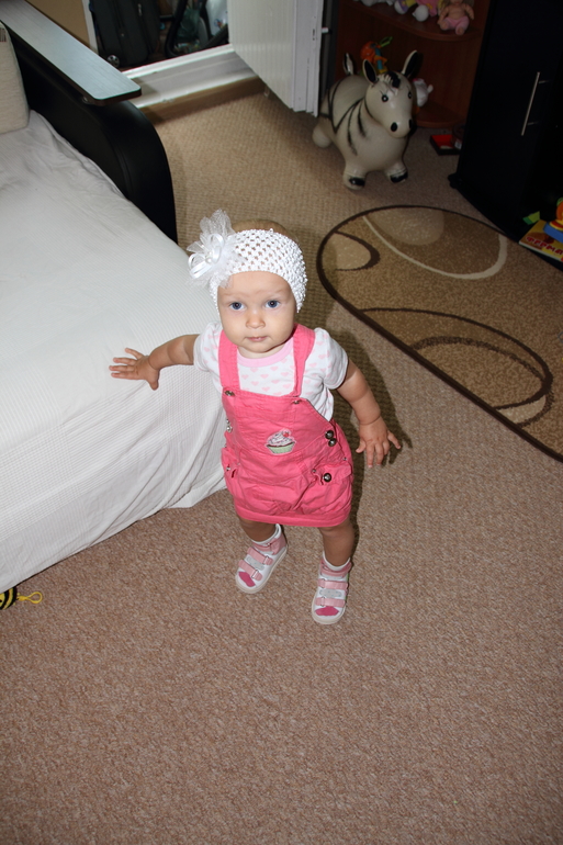 2)Очень хорошо ходит, бегает. За руку не любит ходить, иногда успеваю поддержать, когда преодолевает очередное препятствие. Ничего не боится и шагает везде. Падать не боится. Обычно это происходит тихо. Упала, встала и пошла дальше.