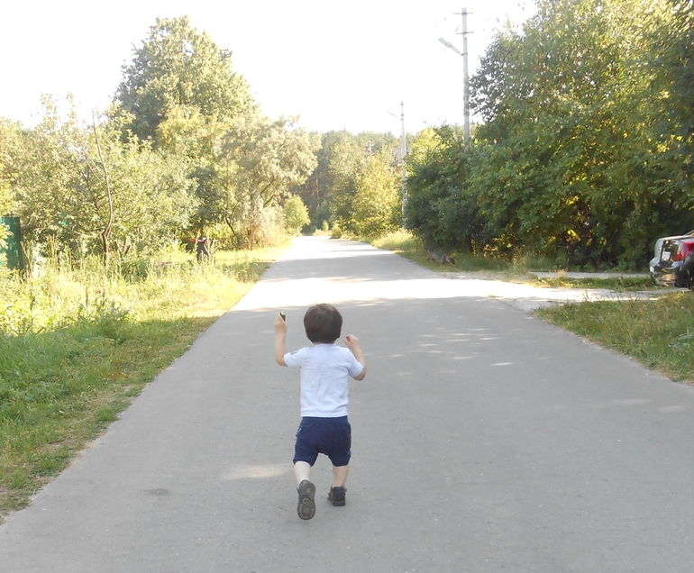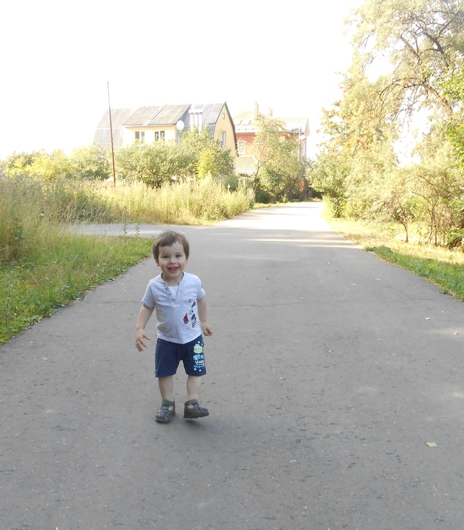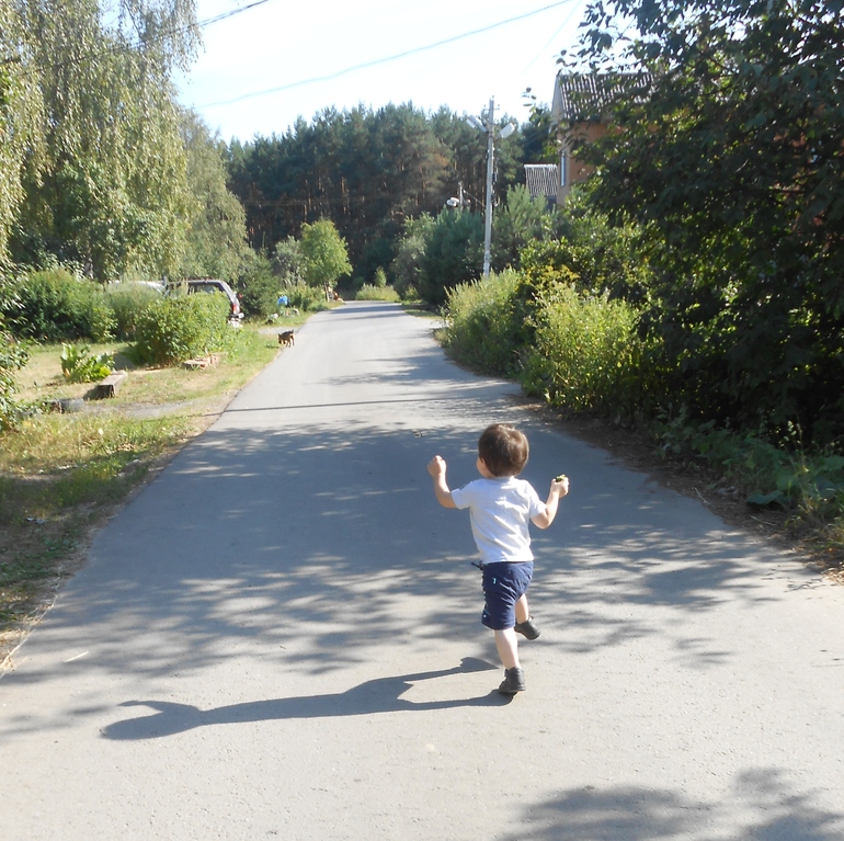 Ну а пока покажу, как мы беззаботно ходили гулять по нашей улице, в конце которой растет и спеет "ничейный" крыжовник)). Соседи угостили нас огурцами, и довольный Помпурец помчался, раскидывая руки и ноги как нескладная марионетка:
