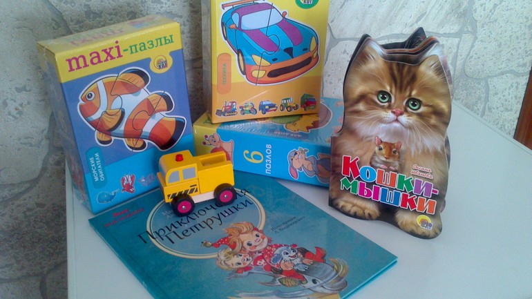 2. Пазлы и книжки. Книжки любит рассматривать, а вот с пазлами еще не знакомились. Отобрала из трех коробок те, которые попроще (из 2 частей).