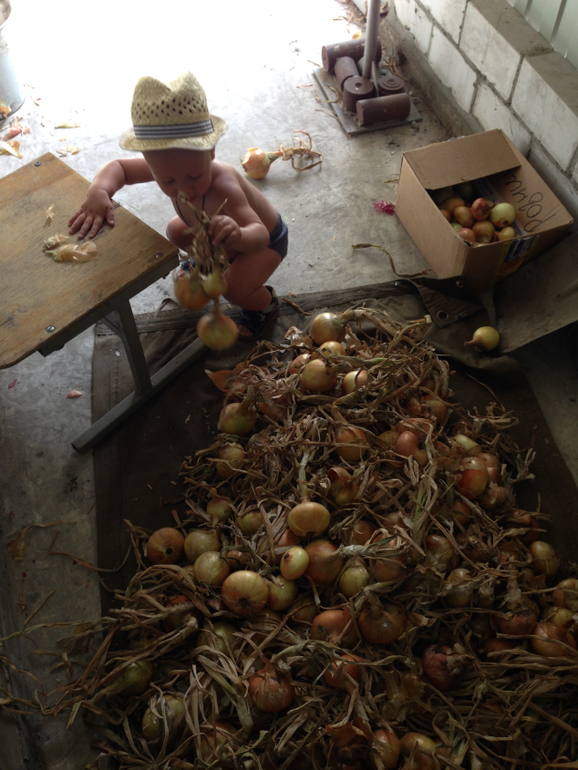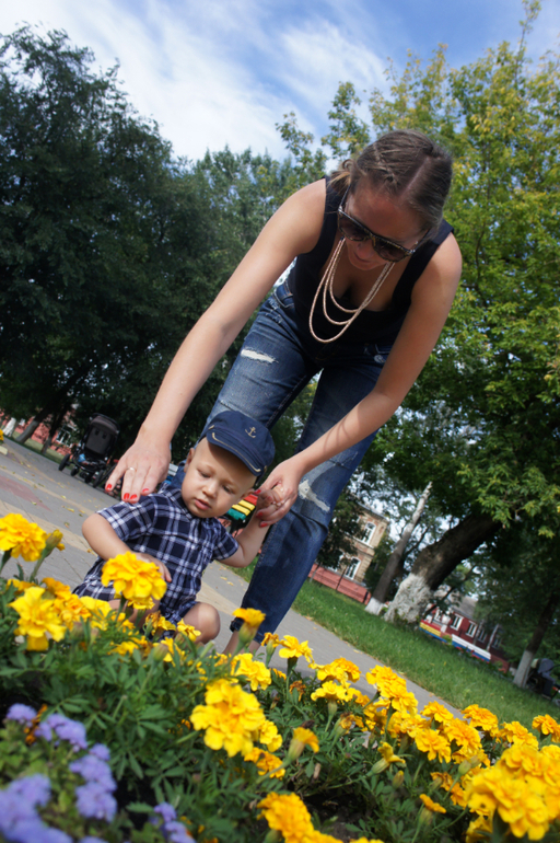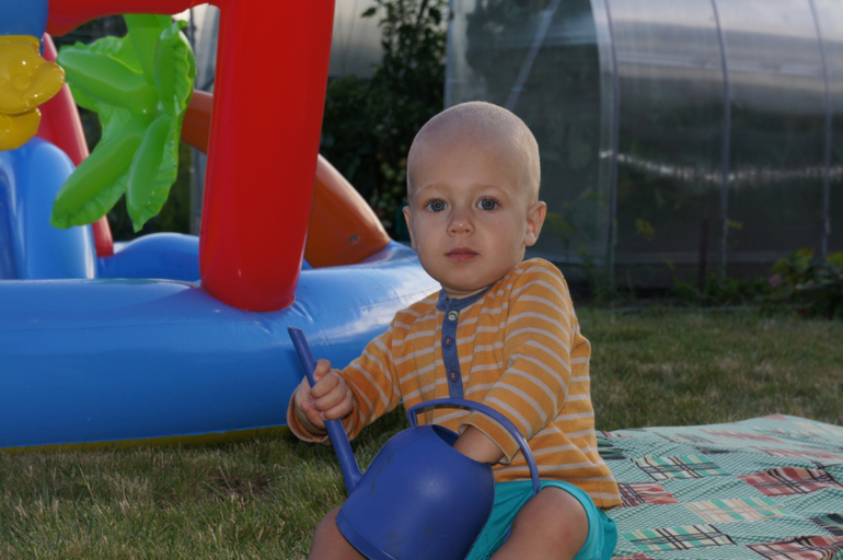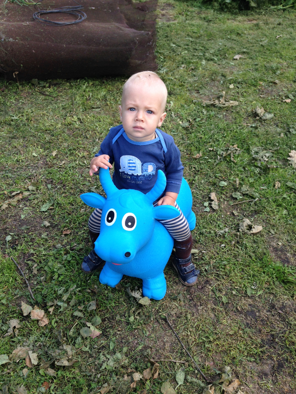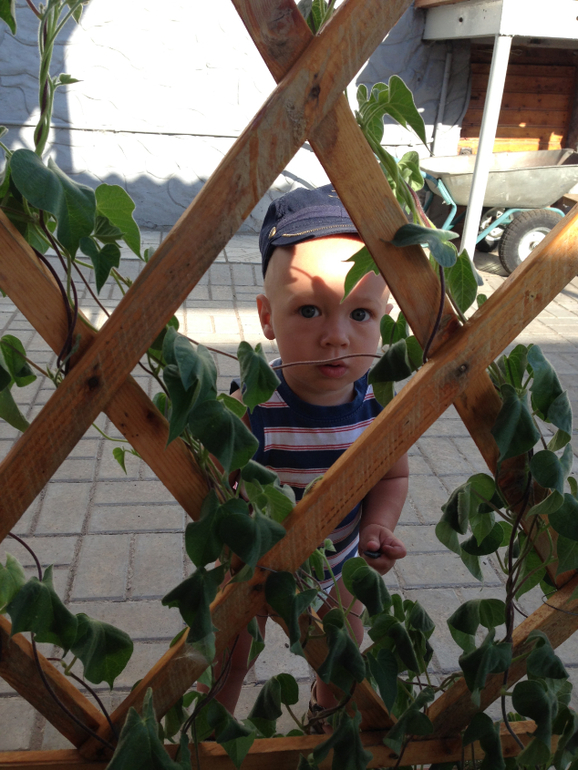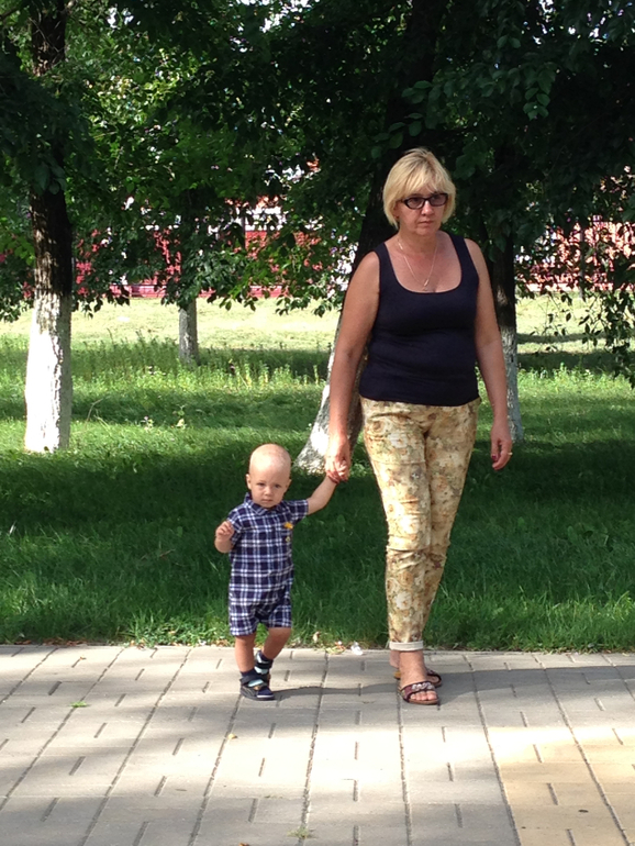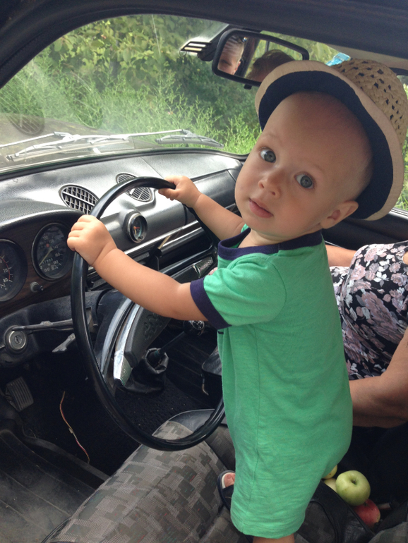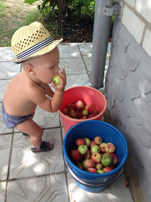 Прокатились мы по родственникам - бабушкам\дедушкам\дядям\тетям. Были в Минске, Белгороде,Новом Осколе. Отсутствуем дома уже 1.5 мес. Было нам очень здорово - природа, Ванек постоянно на свежем воздухе, купались, резвились и кушали вкусности с огорода. Ваня сделал первые шаги в год и неделю (УРА!). В год и месяц прям хорошо зашагал, на ползание редко переходит). Сбитые колени, нос и даже щеки, ссадины, синяки - со всем этим мы уже познакомились. Зубов новых так и нет, 9-й лезет уже с мая. У нас ранние зубы, в 5 мес первый посетил. Подстригли сына... Ээээх, я была против, но меня уломали равномерным ростом волос и я сдалась. Купается в детском басике, хотя взрослый ему больше по душе - с мамой-то поплавать... Помогает прадеду собирать яблоки, перебирать лук - помощник тот еще. А когда видит его (прадедов) жигуль - все, бежит, не оторвать, хлебом не корми, дай за рулем посидеть. Кушает каши, супы, вареные овощи, мясо,омлет, фрукты, ягоды, ну и сисю. У него 2 слабости - яблоки (непременно которые упали с дерева и валяются на земле и свежие огурцы, может есть их в любом количестве.. Спит отвратно, днем куда ни шло, а ночью из рук вон херово и только со мной, перкладываю в кроватку и все- забастовка(((