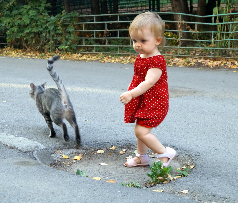 Безумно любит кошечек и собачек!!! только они ее почему-то не очень любят,убегают.