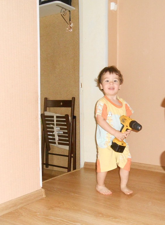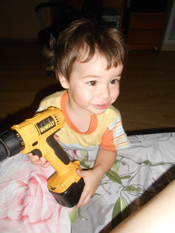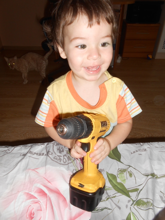 Я очень довольна, что Леня и мужские дела обожает. Мы были в восхищении, когда он подавал Сереже саморезы, лежащие в 2-х метрах, прям доставал из пакетика и по одному своевременно подносил. Кстати, шуруповерт - это его любимая игрушка на сегодняшний день, только успевай подзаряжать)). Но сначала Сережка его ставит на самый слабый режим, что-то там до конца закручивает, потом даем Лене. Я уже и родителям сказала, что бы прекратили покупать всякие коврики с голосом Машеньки, которая учит «названиям друзей» и пр., а подарили бы электроотвертку. Польза какая и игруха, что надо!