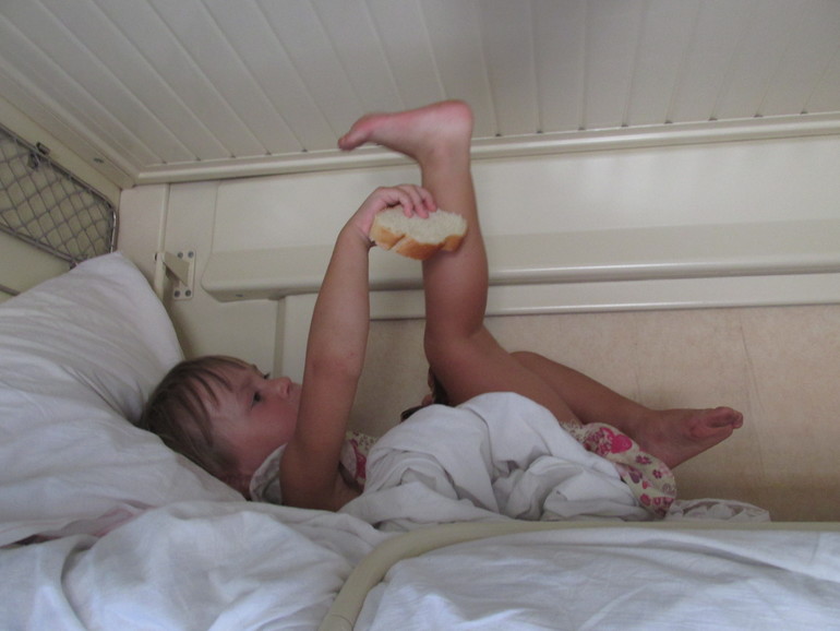 Началось все, естественно, с поезда. Плацкарт в обычном вагоне - это страшно. Я уже забыла, как это, один раз так с мужем уже ездили до свадьбы, надеюсь, больше не придется... я думала, сдохну. Но Лида перенесла неплохо, правда ночью уснуть долго не могла, видимо, новые впечатления. Много рисовала, а я сдуру взяла мало раскрасок. Наклейки клеили. В общем, перетерпели.