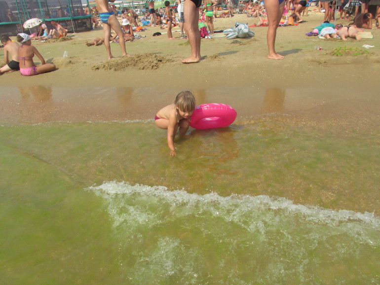 На вокзале нас сразу встретили и уже минут через 20 мы были на месте. Жилье почти соответствовало заявленному, но вот детской площадки не было - первый обман. Слава богу, детей было много и Лиде было с кем играть. Недалеко от дома была площадка небольшая, иногда туда ходили. Но самое главное - выяснилось, что до моря не 20 обещанных минут, а все 50!!! Наши эмоции после поезда надо было видеть. потом я увидела пляж... мы шли пешком по глубокому песку минут 10, таща на себе коляску... ну а само море - это просто... просто... зеленая каша!!!! короче я чуть не плакала в первый день, еще и проблемы со сном у меня начались... Но потом все наладилось, другая дорога оказалась лучше, а потом мы вообще на маршрутке стали ездить (которые битком, зато быстрее, хотя от маршрутки до моря еще минут 15, а еще в них таак душно...) К морю ведет улица Параллия, полная кафешек, магазинчиков, киосков, погулять по которой думаю будет приятно любой женщине, даже если она не шопоголик. Море первые 3 дня с утра было без водорослей, но к концу это стало вообще ужасно, круглые сутки их было очень много. Ну, говорят, они лечебные, ими даже специально натираются, поэтому будем считать это бонусом. Проплыть (в некоторых местах можно пройти) метров....ну 100, и там чистая вода и песчаное дно. Я хорошо плаваю и люблю плавать, Лида тоже воды не боится, мы поплавали. На пятый день пошли волны, Лиде не понравилось (была в манжетах), стала бояться, но в круге я ее уговорила плавать. но уже того интереса к воде не было.