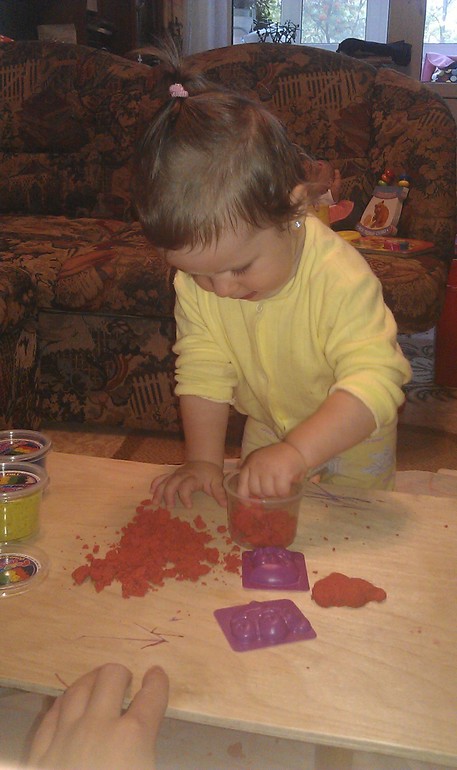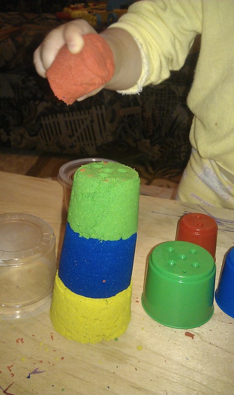 Растем и развиваемсяСегодня мы испробовали песочницу, которую когда подарила моя подруга. Честно говоря,содержимое (4 банки разного цвета), на мой взгляд больше похоже на тесто,что ли... Ну вообщем это придумано,видимо для того,чтобы дома уж действительно не создать настоящую песочницу. Песок не липнет к рукам, легко лепится. В общем Софие понравилось, и мне тоже!) За этим увлекательным занятием время бежит незаметно. София,конечно еще не понимает,что можно лепить фигурки всякие, но она активно мяла песок,складывала его обратно в контейнера, перемалывала слепленые мной шарики с места на место. Ну что говорить, смотрите)