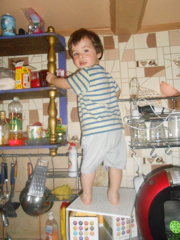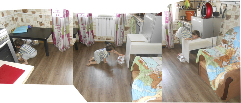 Прекратить это занятие прежде времени, например, убрав одним махом (ух, я какая, семерых одним ударом!) все баклажки, или унеся Леню и заперев дверь, я не могла. Мне кажется, что он бы мне этого не простил. Конечно, мне «неприятно» было смотреть на его подвиги, но оглядев его позы, оценив его положение, решила дать ему возможность побыть на вершине (вершина ли?). Леня, думаю, как и большинство малышей, обладает очень высоким чувством самосохранения, он очень цепкий и осторожный. Я в этом неоднократно убеждалась, помогая слезать с лестницы, ведущей на чердак, или хотя бы со стола.