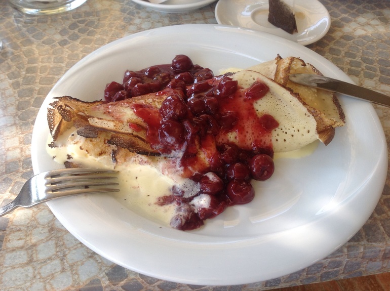 Если по фото непонятно, то это граммов 100 пломбира, завернутых в хороший блин и щедро политых вишней в сиропе)) Этот блин мне будет сниться, когда я вернусь в Москву и начну наконец-то исповедовать ЗОЖ, ну или хотя бы перестану есть сладкое на ночь.