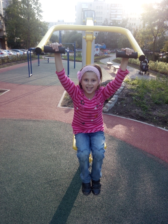 Круто так...и это в обычном дворе....у нас такое покрытие только в центре города на детской площадке около Детского мира))))а вы с сестрой так похожи???Ничего себе...Кристя серьезная такая...Но фотки суперские)))