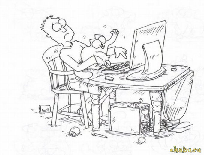 Не разрешает сидеть у компьютера: будет хныкать, залезать на шею или колени, толкать кресло, залезать на стол и все спихивать.