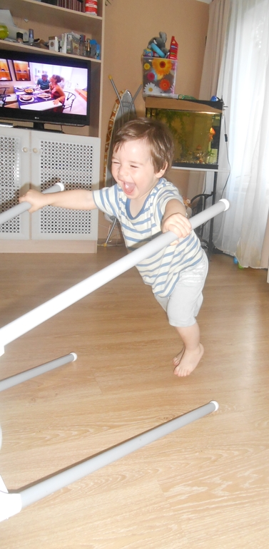 Или, поймав мою хохотайку на задранные назад ручонки, начинает так и передвигаться: