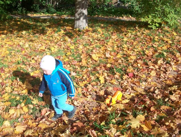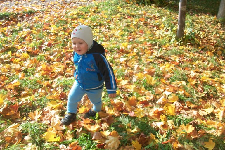 Вот и пришла незаметно, маленькими шажками красавица-осень и одела все деревья в праздничные наряды - желтеющие березки, краснеющие рябины, багряные яблони и рыжие клёны. Под ногами уже шуршат золотые красивые листья, и ты идешь по дорожке из листьев и с наслаждением впитываешь этот их шелест, словно шёпот уходящей осенней поры, этот чистый золотой воздух, пропитанный запахом листьев, эти последние теплые денёчки догорающей осени. Гуляешь по аллеям и радуешься тихой радостью, греешься последним теплым солнышком, и на душе так светло и хорошо. И если раньше я любовалась осенней красотой в одиночестве, то теперь делюсь ею с сыном