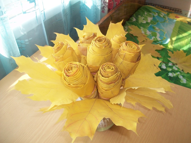 Пока Максим гулял, мама, т.е. я собирала кленовые листья и крутила из них розочки - давно уже мне понравилась эта интернет-идея, но воплощать в жизнь повода не было. А сейчас, пока сын ходил и играл с палочками, я по-быстрому сделала пару розочек. Потом вместе с ним насобирали еще целую кучу кленовых листьев и пошли домой. А дома вот какой симпатичный букет в итоге получился - будет стоять на столе и радовать глаз
