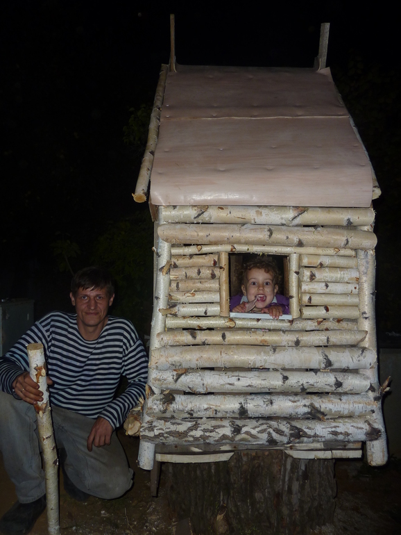 Увидев свою новую резиденцию, дочка пришла в неописуемый восторг. Сложно сказать, кто визжал громче: она от восторга или же местные коты, устроившие драку из-за куска сардельки. Когда первые эмоции поутихли, Тома забралась в избушку и придирчиво оглядела ее изнутри.