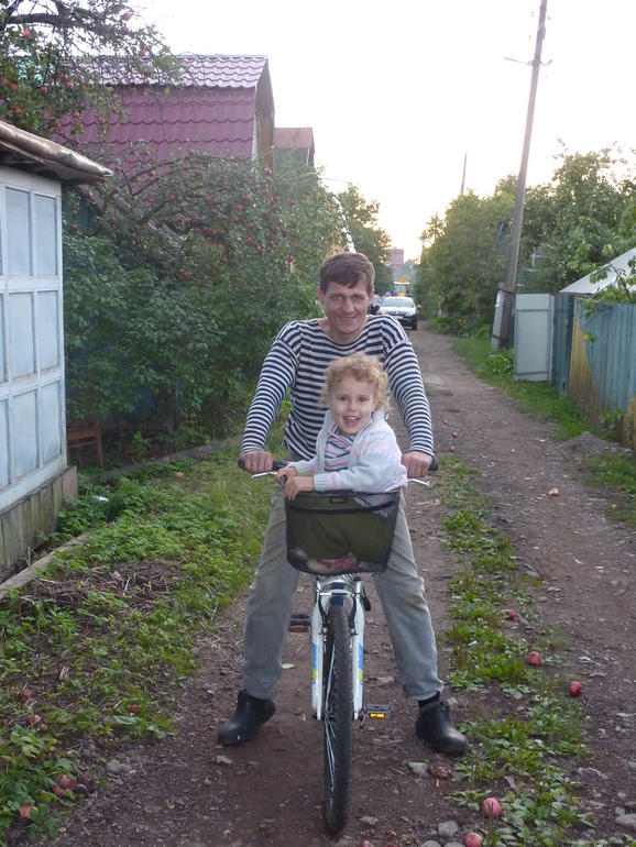 После неудачной вылазки за грибами последовал здоровый общесемейный сон. Потом папа катал Тому на велосипеде.