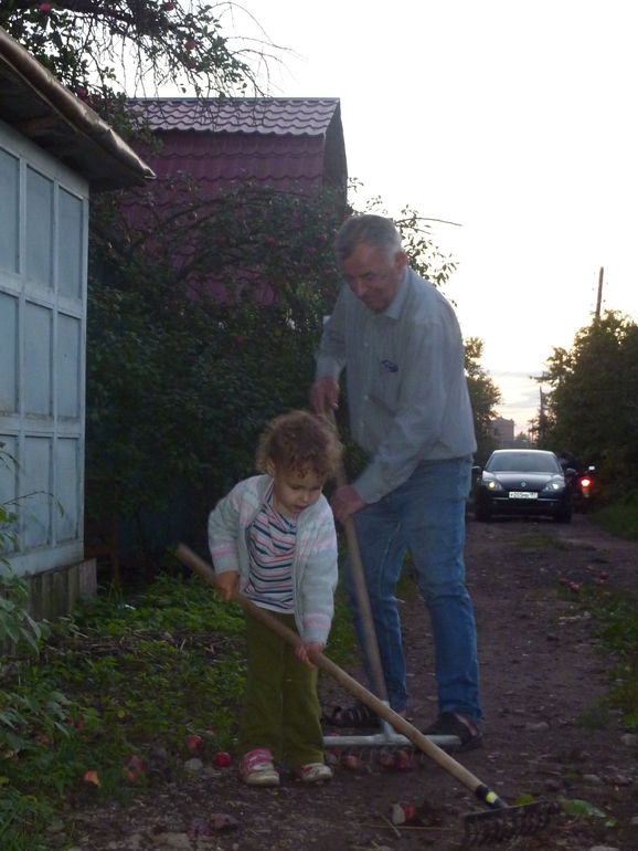 Все вместе мы помогали соседу убирать опавшие яблоки.
