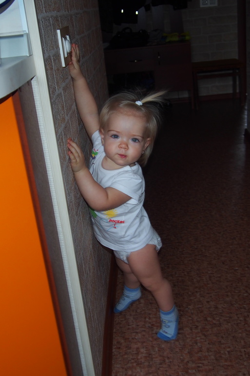 Юляша освоила мастерство выключать свет и теперь мы часто сидим во тьме, т.к. наши дни все короче и в свете нуждаемся все чаще. А Юля не может сидеть спокойно, если кто-то включил свет - надо срочно выключить. Она бы и рада включить (и вообще бы светомузыку устроить), но пока не дотягивается. Хотя однажды упорными стараниями проделала этот трюк. Так тянулась вся, что выбилась из сил и повторить не смогла. Но мы уже предвкушаем эту самую веселую светомузыку))