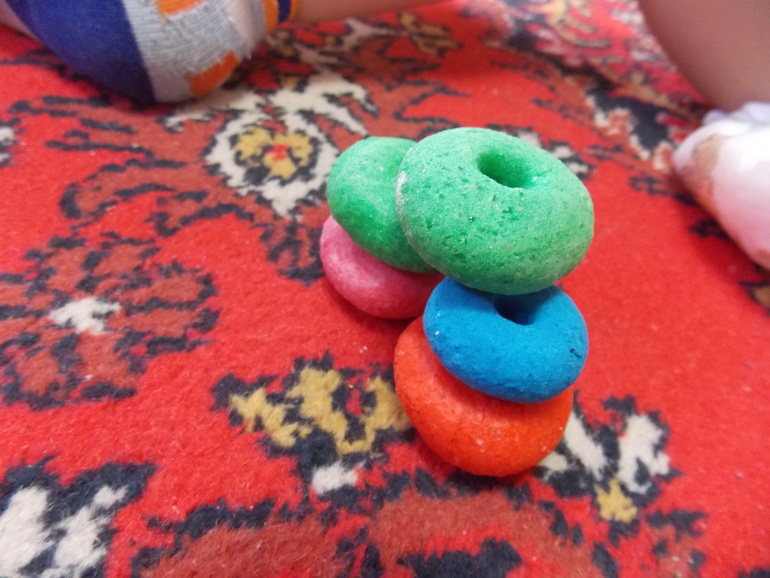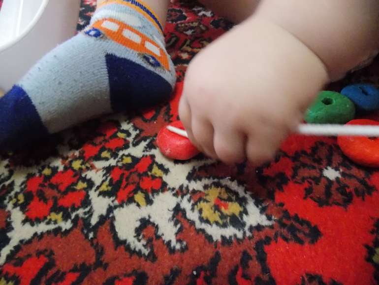Вопросы по досугу с детьмиРешила я, девочки, сегодня познакомить сынульку с солёным тестом...Намесякала...Дала ему пощупать этот "самодельный пластилин"...Ну, судя по его лицу - у него было мало желания лепить вместе со мной. Зато его краски заинтересовали. Пока я лепила, он с ними провозился. Все при деле. Думаю, чтоб такое замострячить незамысловатое, да с пользой. В общем, разделила получившуюся массу на 4 части, в каждую добавила разную краску. Налепила крупные бусины-бублики. И в духовку. Пока сын спал - всё подсохло. Зацените, какая самодельная развивашка получилась