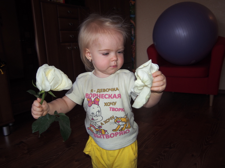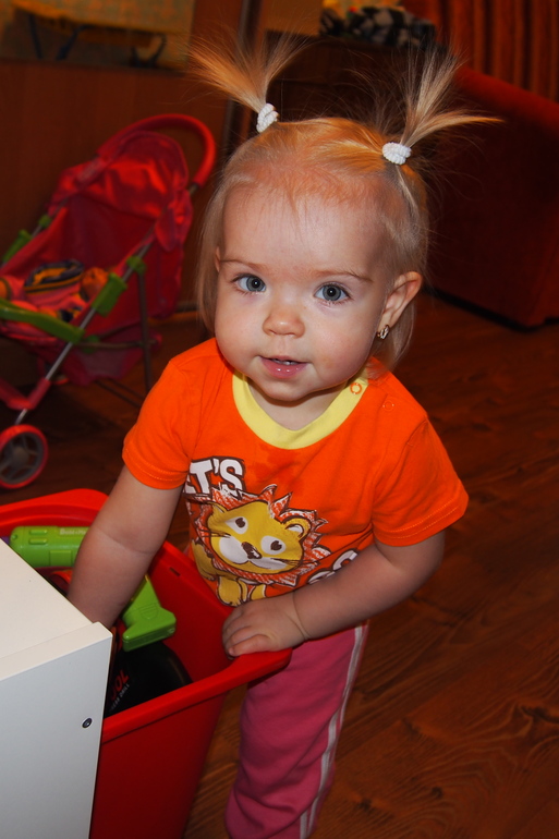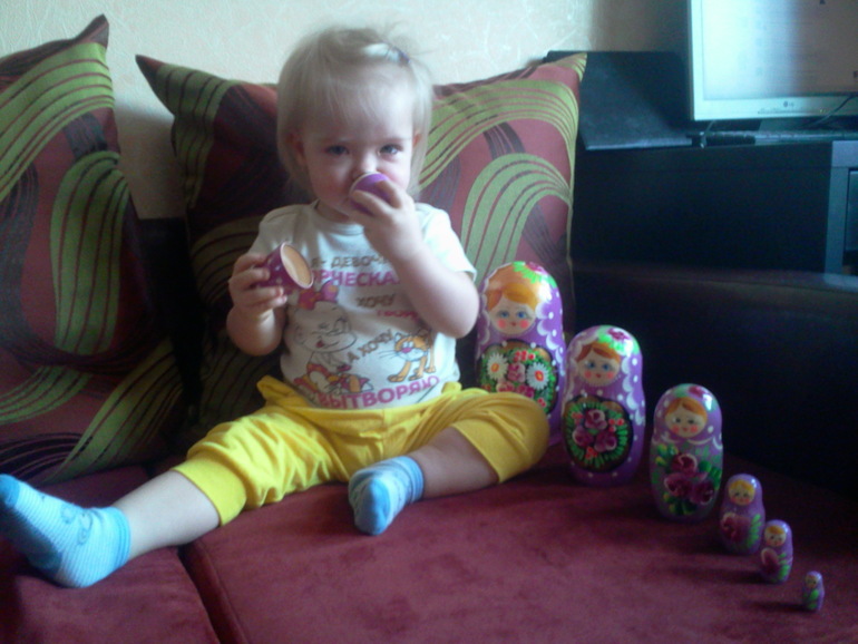 Итак Юлька... Очень много понимает. Выполняет простые действия, когда просят, подражает. Говорит теперь немножко, например, "мама", "папа", "баба" (не обращается к нам, но вспоминается, когда данного человека нет и тогда называет), "дай", "на". Кстати, вчера выдала прилюдно: "Ма дай", когда я кормила ее булочкой, как бы попросив следующую порцию. Хотя мужу показалось, что она сказала то ли "ня-ня" (ням-ням), то ли "нада". Но оставшиеся пара человек и я убеждены, что она у меня предложением попросила. Правда, словарного запаса мало, чтобы общаться и я прям вижу, как ей тяжело с этим жить. Потому что желания есть, а выразить никак. Она капризничает, ноет, показывает пальцем. Иногда просто руки в кулаки сжимает с досадой или злостью. Я ей сочувствую, конечно. Пытаюсь понять, угадать, что надо, или отвлечь, на худой конец. Скорее бы речь появилась по-настоящему и всем будет проще.
