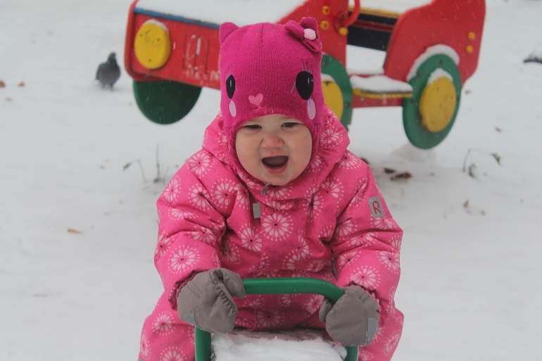 Класс, зима. Снежок... А у нас жуть серая погода, дожди и холодно. Бррр. Скажите у вас это рейма тек? Как малышка не мерзнет, сколько у вас, утеплителя? И скажите краги какой фирмы?