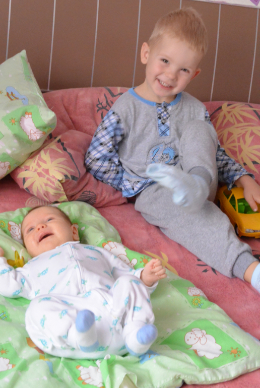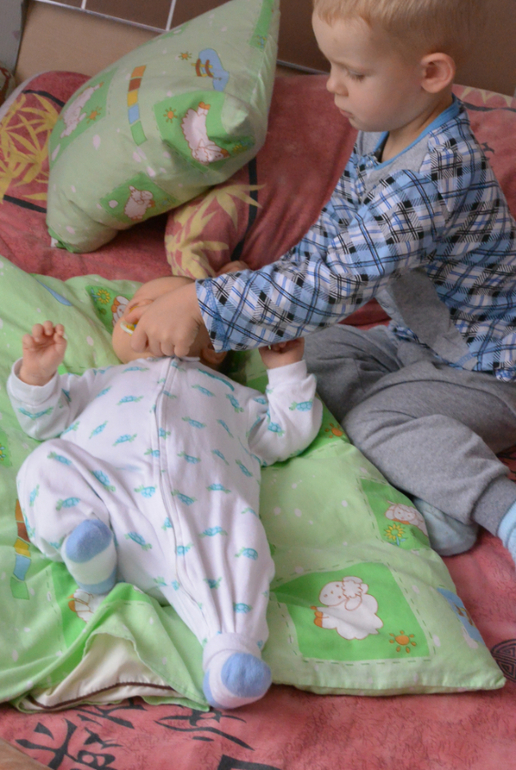 . Спит как и раньше сам в своей комнате, летом немного ее обустроили, заказали сразу дубовую двухэтажную кровать взрослых размеров( и очень кстати, приходится иногда дремать около него, так места хватает, даже иногда укладывая его, еще ложусь и Дашу кормить/присыпать рядом с ним), стелаж под игрушки заказали, стол и стулья икеа купили, коврик с бибиками постелили, теперь комната мамло мальски имеет право носить звание "детской"!). Помогает по дому многое, особенно обожает пылесосить и мыть полы с папой, а маме белье развешивать помогает))). Очень боялась реакции на сестричку, пока была Б, на все разговоры о сестричке кричал...неее сиси....но все нормально, сразу показали ему спящую лялю в кроватке, сказали, что это его сестричка Даша, он так осторожно заглядывал по началу проговорил сисика), но почему то он говорит на Дашу Ева)...в лучшем случае Даву( так он еще на своего друга Данила говорит)...постоянно хочет к ней прижаться, гладит, даже на руки хочет взять, вечером прощается перед сном, утром обязательно заглядывает на нее спящюю, уже начал помогать: иногда покачает в шезлоне, соску даст...кстати, по началу забирал и себе в рот совал, но уже и вовсе не помнил, что с ней делать...но прошло...бывают некоторые небольшие моменты ревности конечно, но быстро переключаю его)...вот такой Илья у нас старший братик!) Наш любимый сыночек!