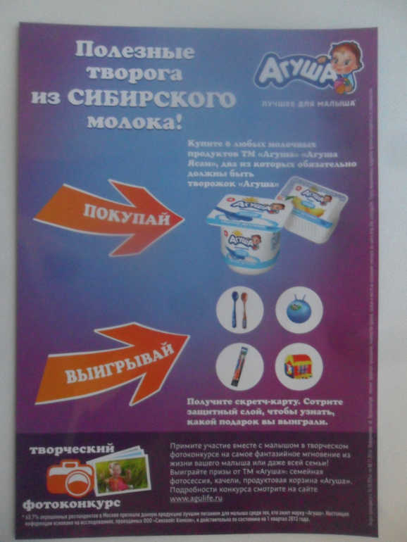 Вопросы по досугу с детьмиДля участия в акции нужно купить любые 6 моолочных продуктов "Агуша", предоставить чек о покупке промоутерам, выбрать любой билет, стереть на нём защитный слой. Нам попался билет со словом "палатка"!))) Разыгрывались детские ложечки, зубные щёточки, мячики и палатки))) и вот мы выиграли самый "крутой" подарок)))