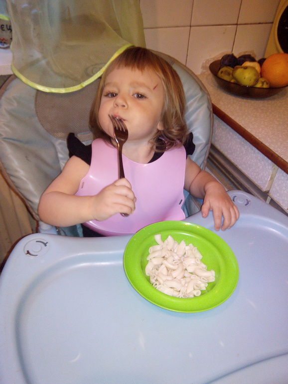 Ест сама - больше любит вилкой) - блендер убрала, так как уже жуем все сами - кусочками! И мясо тоже)) Любимое блюдо - МАКАРОНЫ!