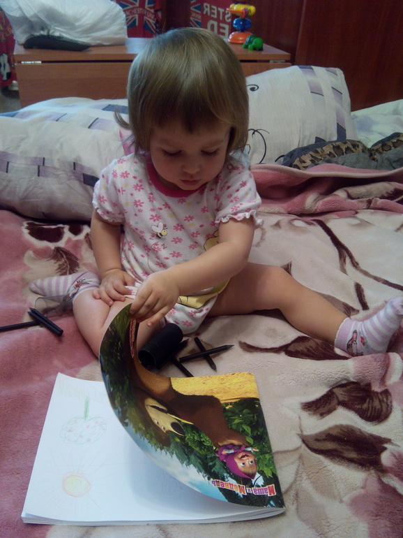 Вечером играем дома - в последнее время любит рисовать - купила восковые мелки! ВЕЩЬ! Играем в пирамидки) в мячи) читаем книги) смотрим мультики и РЕКЛАМУ! Когда папа выходный - едим по магазинам - ну очень любит кататься на машине!!! С парадной выходим - бежит к машине - и главное - знает к какой - к моей!