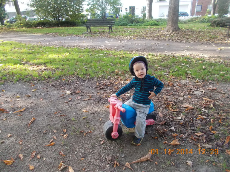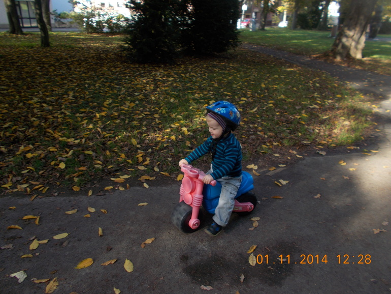 Недели 2 Стефан дома катался на этом мотоцикле, но дома не хватает места для этого. И вот сегодня мы впервые вынесли его в парк. Сын быстро освоился и гонял счастливый по всему парку.