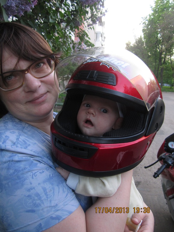 А потом мы ему еще и шлем примерили (не волнуйтесь, шлем держится на моей руке, а не голове ребенка).