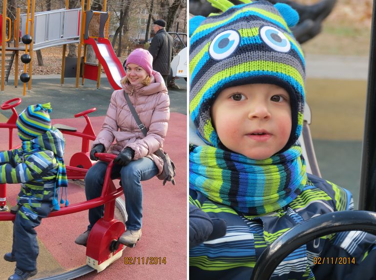 А далее на площадке у Лёни начинается любимая сюжетная игра. Карусель - это его машина. Лёня рулит, когда бензин заканчивается просит меня "си" (сильно) толкнуть его до заправки. Доехали: заправка - она же горка. Лёня усаживается поудобнее, мимо проскакивает вымышленный папа, деда. Лёня заводится "тык" и скатывается. Внизу я заправляю его, тряся за курточку, и Лёня едет на карусели дальше. Остановки: парк (играем в прятки, мяч и пр.), вымышленный магазин (Лёня любит покупать булку) и другие.