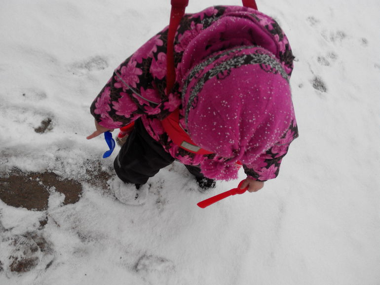 Первую снежную прогулку пришлось сделать быстрой, потому что снегопад просто резко усилился, да ещё стал очень мокрым. Налип на ножки, что очень не нравилось моему гномику, который пальцем показывал на снежные сапоги.
