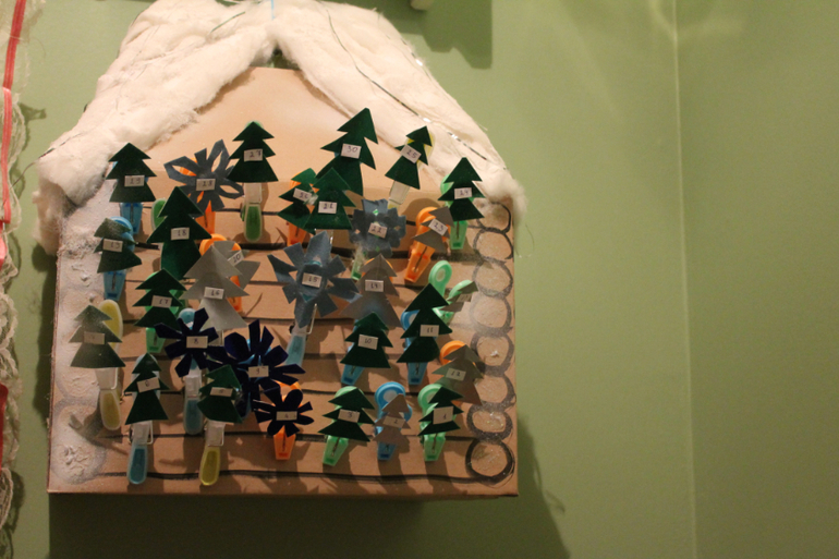 Вот что у нас получилось) В мешочках каждое утро нас ждут сюрпризы( снеговички, снежинки, конфетки, наборы с заданиями) а к прищепкам на домике я прикрепляю записочки с заданиями.