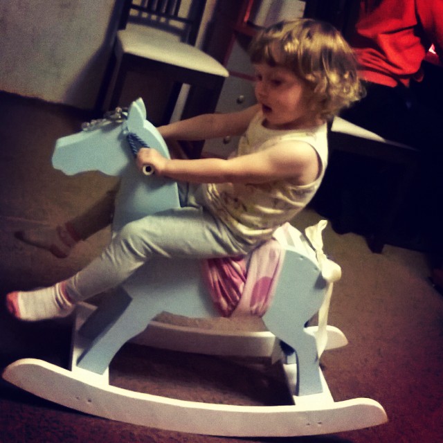 И еще похвастаюсь! Наш папа делает деревянных лошадок. Эскиз рисовала я, конструкцию придумал он, так что полностью ручная работа. Если есть желающие - можем повторить! Наш коняга уже год с строю, с ним все ок)))