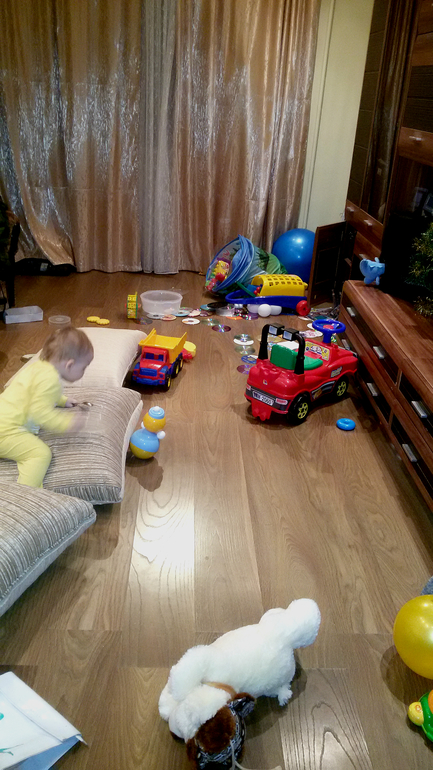 И вы не довольны???? У нас всё тоже самое, только в раза три больше+изрисованы стены+пластилин по всюду+детская посуда+вода+еда и т.д. И всё это не в одной комнате, а как минимум на 150-160 квадратных метрах.