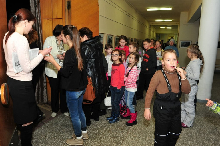 Пришли, переоделись и сели мин за 10 до начала. Ряд, кстати, у нас был 6 и места с которых очень хорошо видно сцену. В начале тихо себя вела, разглядывала лица соседей. Ко второму звонку ей уже надоело сидеть и начала делать попытки вырваться. К третьему уже начала откровенно хныкать и пытаться вырваться с криками и психами, я уже думала пора выдвигаться на выход, чтоб другим не мешать и тут...
