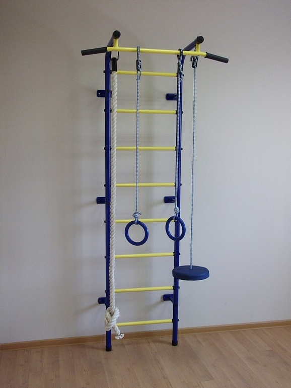 Первого не надолго хватит.А такие,как второй вариант есть с распорным креплением,т.е. упираются в пол и потолок,ничего сверлить не надо.Тоже сейчас выбираю спорт.уголок,читала,что заматывают верхние ступеньки,чтоб малыши высоко не поднимались.Ну,и мат на пол)