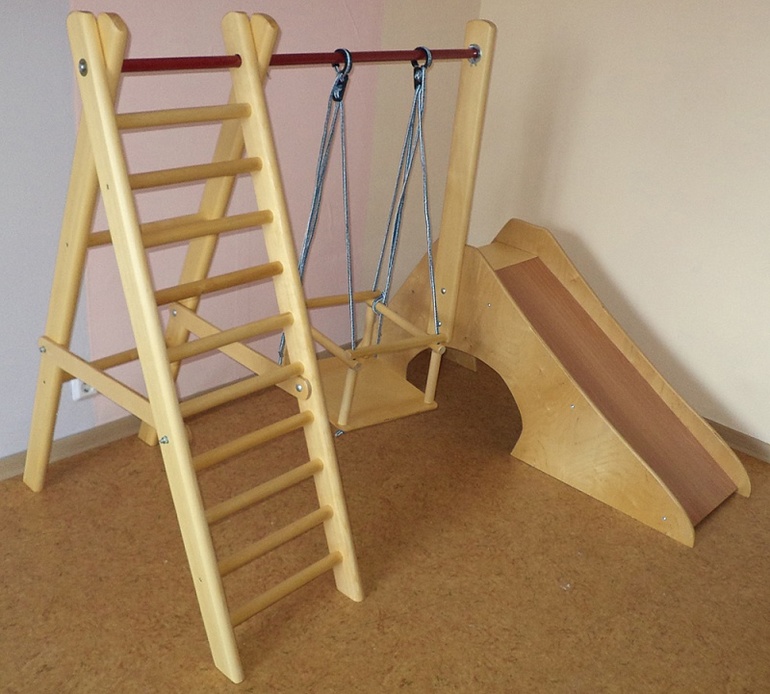 У нас первый вариант, он занимает очень много места, но у нас однокомнатная квартира, поэтому мы его разобрали и используем частям:) горка стоит отдельно, лестницу прикрутили к стене. По лестнице научился лазить быстро, и начал лихачить, а с горки катается до сих пор.