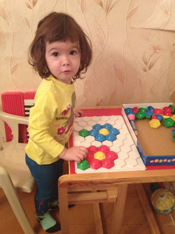 Сашуля вчера получила первый подарок от своей любимой тети! Праздник начался!) Очень интересная мозаика, Сашуле понравилась