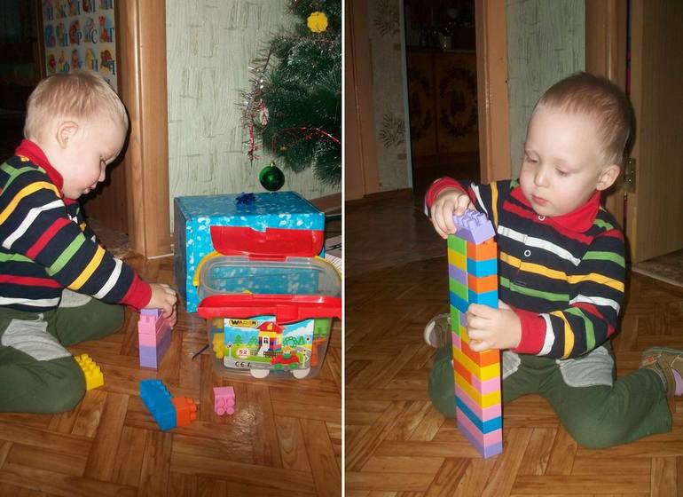 Сказала, что Максимке Дед Мороз подарил самую большую коробку - голубую. Мы отрезали ленточку, и Максим достал свой подарок... конструктор! И сразу же начал катать лежавшую сверху машинку