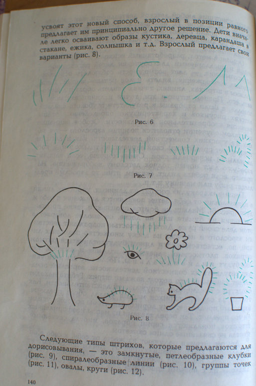 Первые «каракули» состоят из длинных, коротких линий в направлении от себя, затем появляются движения к себе и дуги (рис. 6). Другие штрихи получают из жеста от себя, к себе в определенных конфигурациях (рис. 7). Дети вначале легко осваивают образы кустика, деревца, карандаша в стакане, ежика, солнышка и т.д. Взрослый предлагает свои варианты (рис. 8).