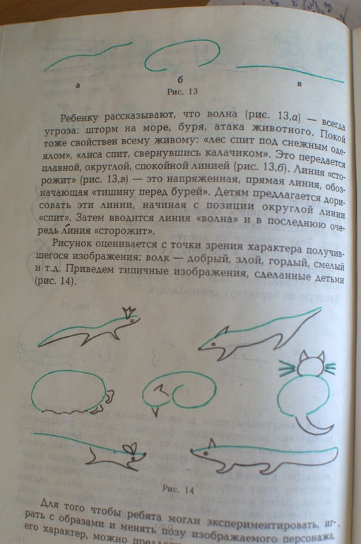 Ребенку рассказывают, что волна (рис. 13,а) - всегда угроза: шторм на море, буря, атака животного. Покой тоже свойствен всему живому: «лес спит под снежным одеялом», «лиса спит, свернувшись калачиком». Это передается плавной, округлой, спокойной линией (рис. 13,6). Линия «сторожит» (рис. 13,в) - это напряженная, прямая линия, обозначающая «тишину перед бурей». Детям предлагается дорисовать эти линии, начиная с позиции округлой линии «спит». Затем вводится линия «волна» и в последнюю очередь линия «сторожит».
